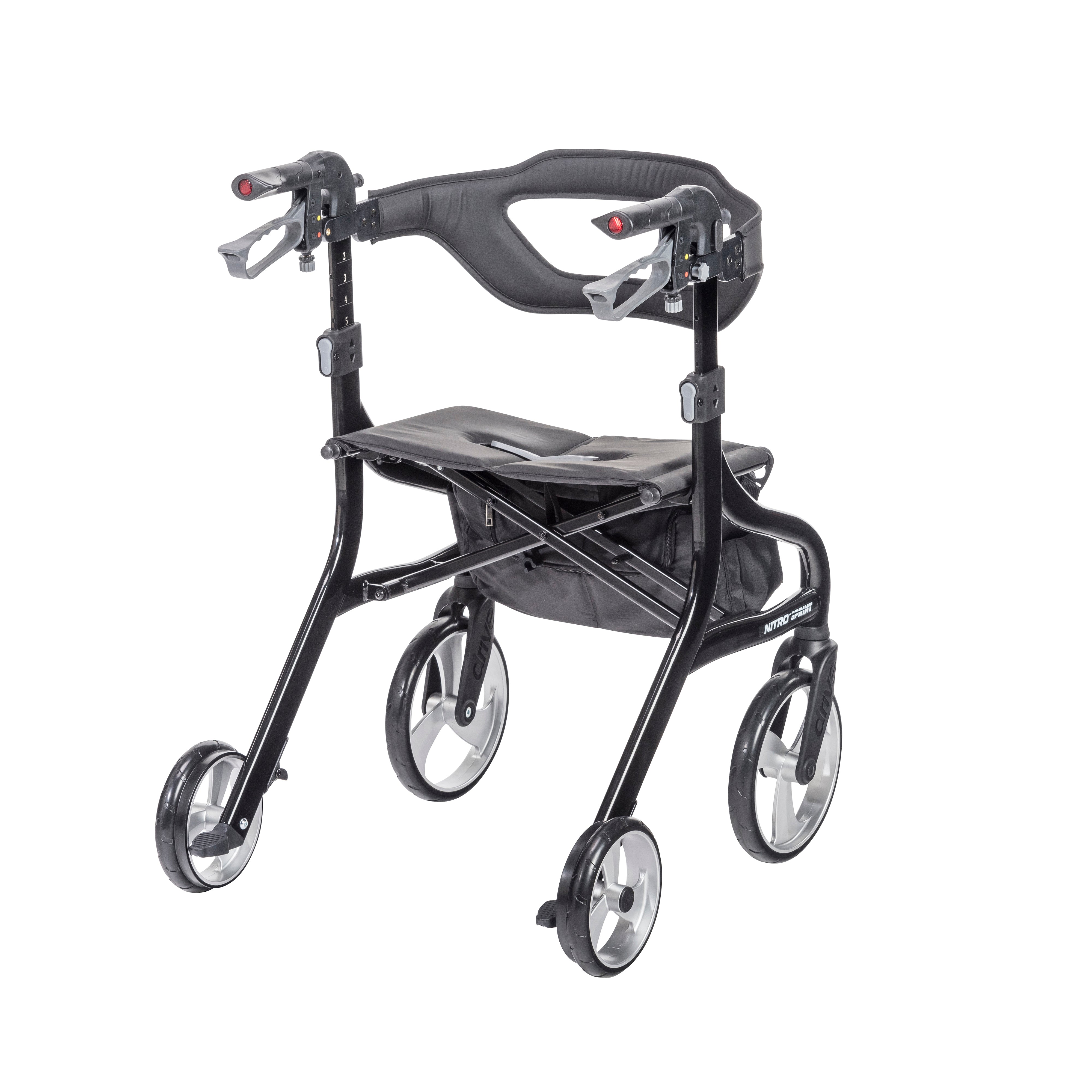 The sleek Nitro Sprint Rollator is designed to provide comfort, convenience and control at every turn. The rollator sports a unique braking system that reduces tire wear and an integrated slow-down brake for safer maneuverability over diverse terrain. When not in use, the rollator can be folded side to side with one hand and locked in place for easy transport. Other features include multiple storage bag mounting points and a wider backrest with a window for improved comfort and visibility.