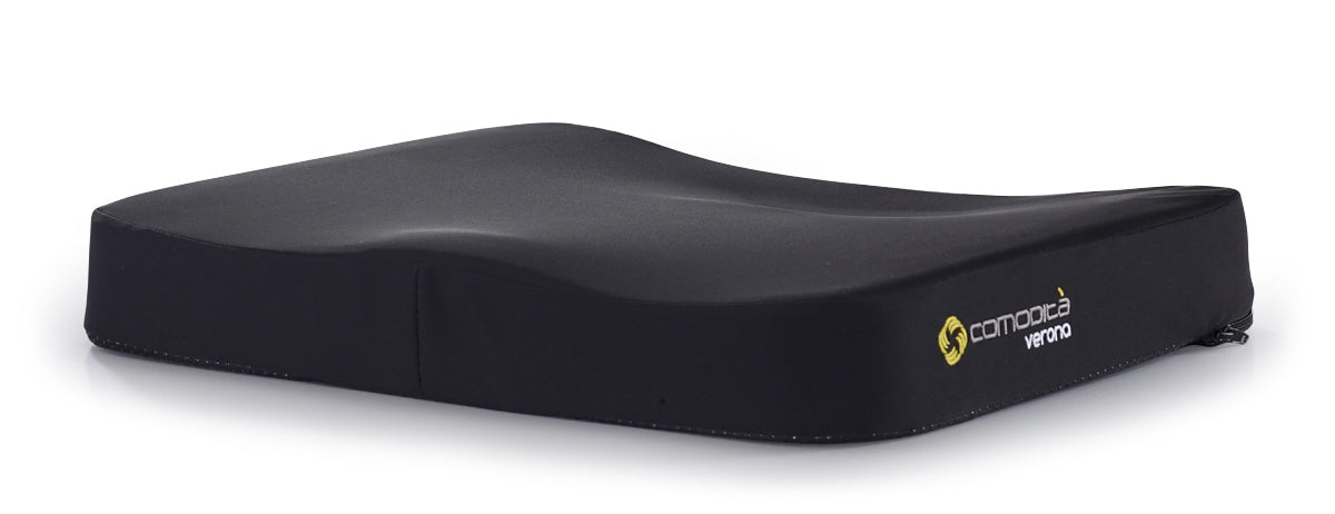 This cushion has an exclusive COMODITÀ contoured design, is highly resilient and has a waterproof cushion cover. The coccyx relief contour and heavy-duty foam provides comfortable and supportive seating. Additionally, the fabric on the bottom is skid-resistant and provides ultimate comfort for regular chairs, wheelchairs, car seats, airplane seats. It comes with a cushion carrying case and is great for travel.